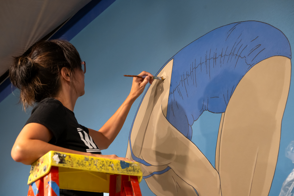 Jenifer K Wofford’s painted mural pictures Victoria “Vicki” Manalo Draves, the first Asian American Olympic gold medalist, suspended in a pike in a vast gradient of color. Born and raised in San Francisco’s South of Market district, the Filipina American diver was also the first woman awarded gold medals for both the ten-meter platform and the three-meter springboard competitions at the London 1948 Olympic Games. For VMD, Wofford was compelled by imagining a “soft inward focus combined with the mannered tension in her body’s position, both completely on display and totally inside herself.”