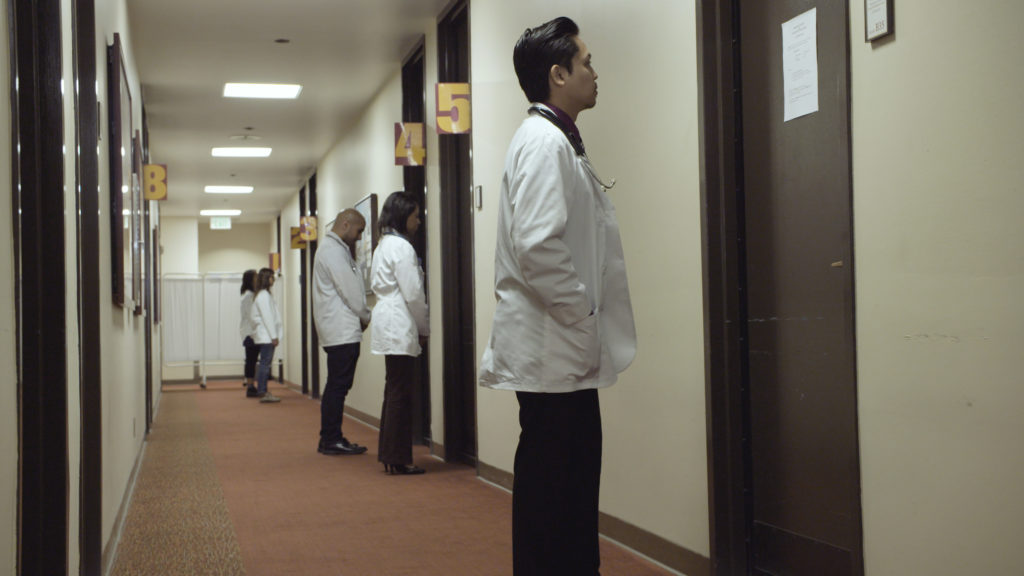 In Tribe’s New Work exhibition, an angled screen presents a progression of SP encounters on one side and a synchronized montage of supporting materials on the reverse. Fragments of the patients’ scripts, diagnostic flow charts, and textbook illustrations offer glimpses of the kinds of information that underlie the action. The encounter format, too, suggests that these performers inhabit a dual headspace—holding conversations while mentally tracking checklist items to be submitted afterward—an inversion of roles in which the “patients” are now the evaluators. The paradox of the SP exam lies in its artifice: both parties are acting while also being themselves. Yet there is the potential for medical student and actor to connect when both willingly suspend disbelief. Throughout Standardized Patient are details that underscore the aspect of time—shots of wall clocks, glances at watches, the interruption of a PA announcement—and the various recording and surveillance devices that signal the mediation involved in the elaborate exam staging. The neutral palette of this place for care and comfort cannot fully mask its strange details or conceal the fact that it is a charged environment no one wishes to spend much time in. Indeed, hospital anxiety is often amplified by the anticipated costs of care. Tribe’s Standardized Patient and her related work Rinse and Repeat were developed over the past year, a period of intense political debate and protest around access to affordable health care in the United States.[7] As personal accounts of fear and outrage at the prospect of losing medical insurance flood news outlets and social media, there is perhaps no better moment to reflect on the need for greater public accountability and for empathy with the perspectives of others.