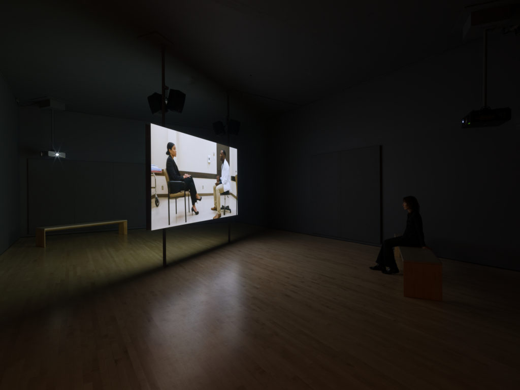 Kerry Tribe’s Standardized Patient (2017) reflects on this phenomenon, exploring larger questions around empathy, communication, and performance. The artist learned about this specialist area of the acting profession from a relative who once worked as an SP. As Tribe observes, “It’s a performance for an audience of one, and it’s carefully scripted for ‘content,’ but the way an encounter unfolds is highly spontaneous. . . . I’m most interested in the unexpected, often awkward ways these strangers manage to connect in their encounters, and in the ways these connections can be missed or go awry.”[2]