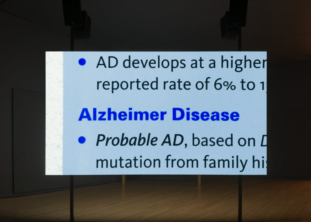 Throughout Tribe’s work, there is a distinctive attention to the ways the physical form or apparatus of time-based media installations can mirror cognitive processes. Her installation H.M. (2009) recounts the famous story of “Patient H.M.,” who lost his episodic memory after undergoing experimental brain surgery for epilepsy in 1953: he would forget everything that happened to him within about twenty seconds. Tribe’s retelling not only relates this tale of severe memory impairment but also re-creates the experience of short-term memory loss by looping the single 16mm film through two projectors with a twenty-second delay between images. Her multifaceted project about aphasia is a continuation of this approach, describing the condition and also “producing” some aspect of the dissociation that characterizes the aphasic experience.