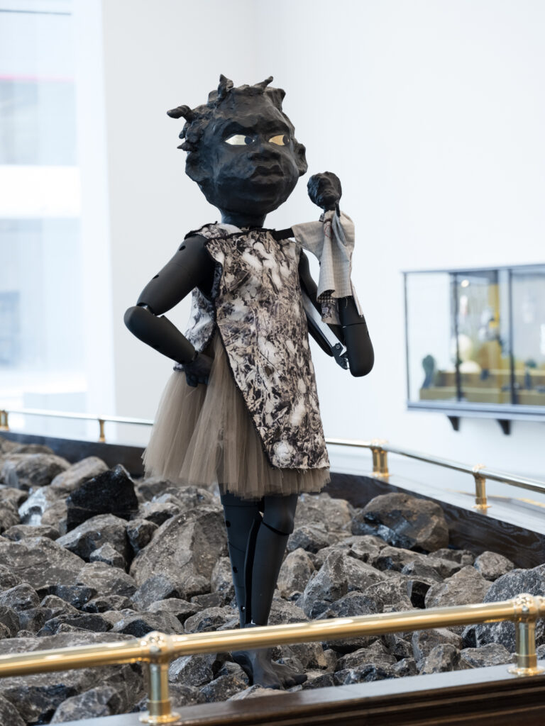 Kara Walker has long been recognized for her incisive examinations of the dynamics of power and the exploitation of race and sexuality. Her work leverages expressions of fantasy and humor to confront troubling histories and dominant narratives, repossessing control in the process. Inspired by a wide range of sources, from antique dolls to Octavia Butler’s novel Parable of the Sower, Walker’s new commission, Fortuna and the Immortality Garden (Machine), considers the memorialization of trauma, the objectives of technology, and the possibilities of transforming the negative energies that plague contemporary society. Here, automatons trapped in a never-ending cycle of ritual and struggle are repositories of the human soul. They recall mechanized medieval icons that evidenced divinity, vitality, and the promise of faith. Situated within an energetically charged field of black obsidian from Mt. Konocti in Lake County — a volcanic glass with deep spiritual properties — Walker’s Gardeners evoke wonder, reflection, respite, and hope. Just past this prophetic vignette, the installation’s namesake, Fortuna, responds to each visitor with a choreographed gesture and a printed fortune fresh from her mouth — an offering of absolution and contemplation.